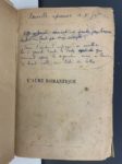 - L'Aube romantique. Jules de Rességuier et ses amis. Chateaubriand, Emile Deschamps, Sophie Gay, Madame de Girardin, Victor Hugo, Lamartine, H. T. de Latouche, Sainte-Beuve, A. Soumet, Eugène Sue, Alfred de Vigny et autres. Paris, Mercure de France, 1910. In-12, velin à recouvrements, dos lisse, auteur et titre manuscrits (dernier feuillet lacunaire et collé, déchirures en tête de pages sans manque, sans le portrait).