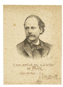 21,5 x 15,5 cm (rousseurs). Portrait dédicacé par le compositeur à Henri MIRAL, directeur du Grand-Théâtre de Montpellier : “À mon excellent ami et directeur Mr Miral. Cher souvenir. Massenet. 1897.”