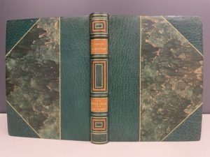BARTHÉLEMY. LEMONNIER (Camille). Au coeur frais de la forêt. Paris, Mornay (Les beaux livres, 13), 1922. In-8, demi-maroquin vert sapin à coins, dos à 4 nerfs saillants, pièces d'auteur et titre maroquin fauve, caissons mosaïqués et bordés d'un filet dorés, filets dorés aux plats, tête dorée, couv. ill. et dos conservés [R. Blaizot].