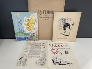 - Air France, Dîner en plein ciel chez Carrère le Mercredi 10 mai 1950. 4 p. in-4. (taches et nombreuses esquisses de personnages p.4 effacées).