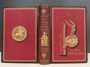 [Mode. Costume]. DEMAY (G.). Le costume au Moyen Âge d'après les sceaux. P., Dumoulin, 1880. Fort volume grand in-8, rel. édit. demi-chagrin rouge ornée de décors dorés, tranches dorées. 2 chromolithographies h.-t., nbr. fig. en noir dans le texte.