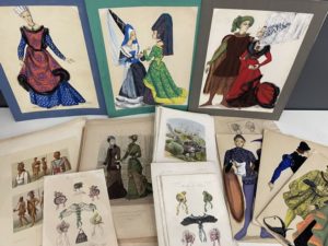 - 7 gouaches sur les costumes des XIVe-XVe siècles.
