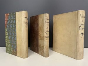 - Le jardin des caresses. Traduction de Franz Toussaint. Paris, L'édition d'art H. Piazza, 1919. Demi-parchemin à la bradel, auteur et titre manuscrits, filet rouge et doré, tête dorée (couv. inf. et dos conservés).