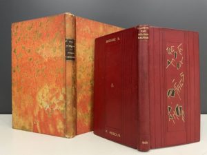 SAUVAGE. REBOUX (Paul), Madame X... Trente-deux poèmes d'amour. Paris, Crès, 1923. In-18, plein chagrin grenat, dos lisse, nom d'illustrateur et date dorés, titre mosaïqué sur le plat sup., noms d'auteurs dorés sur le plat inf., filets à froid sur les plats, tranches dorées, couv. et dos conservés [H.R. Labussière] (infime trace d'encre en marge du tite).