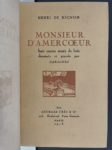 - DARAGNÈS. RÉGNIER (Henri de). Monsieur d'Amercoeur. Huit contes ornés de bois dessinés et gravés par Daragnès. Paris, Crès, 1918. In-8, cartonnage papier marbré orangé et doré à la Bradel, pièce de titre basane aubergine, couv. et dos conservés (coiffes un peu frottées, légers transferts des bois).