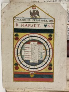 On y joint : "Calendrier perpétuel R. Manset. 48". Dessin original manuscrit signé Manset fecit et pixit. Au dos " Comensé (sic) le dessin le 7 juin 1813. Comensé (sic) l'écriture le 18 juin 1813" (en l'état).