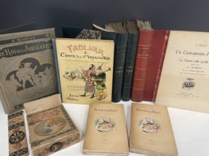 - Fabliaux et contes du Moyen-Âge. Paris, Renouard, Laurens, 1926. In-4, demi-percaline éditeur, plats en cartonnages illustrés (frott. 2 coins cassés, charn. int. sup. faible).