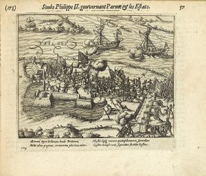 2 volumes in-4 oblong de (2) ff. [sur 4], 468 pp. mal chiffrées 466 sans manque ; (2) ff., 493 pp., (7) ff. de table : vélin moderne à rabats, tranches marbrées. Première édition française du De Nassausche Oorloghen paru chez Colin l'année précédente, 1615. Elle est dédiée au roi d'Angleterre, Jacques Ier Stuart. LA GUERRE DE QUATRE-VINGTS ANS. Ralliées au Saint Empire romain sous le règne de Charles Quint (1500-1558), les Provinces-Unies néerlandaises se révoltèrent contre le joug espagnol dès l'investiture de Philippe II d'Espagne. Des tensions, tant sur le plan économique que religieux et politique, évoluèrent en une véritable guerre. C'est au terme d'un conflit de 80 ans que les Provinces-Unies obtinrent leur indépendance avec la signature de la paix de Westphalie (1648). BELLE ILLUSTRATION GRAVEE SUR CUIVRE : 1 FRONTISPICE, 23 PORTRAITS ET 257 PLANCHES A PLEINE PAGE, sauf la dernière à double page : vues, scènes de batailles, exécutions publiques, entrées, réceptions, cartes et plans, etc. DANS LE TOME PREMIER, LA PLANCHE PAGE 443 MONTRE LA PRISE DE WESTERLOO PAR LE COMTE DE MANSFELD LE 5 JUIN 1583, “chasteau fort & d'importance, assis en la champagne de Brabant, sur la riviere de Nethe. Quelques villageois, soit par affection qu'ils portoient aux Espagnols, ou bien pour estre d'autant plus tost delivrez de leur armee, enseignerent à Mansfeld une vallee, assise à demi lieuë du Chasteau, dans laquelle il pourroit tirer l'eau de Westerlo.” Exemplaire en vélin moderne portant, à la fin, une note datée de 1617. La planche n° 5 est contrecollée ; elle remplace une planche imprimée par erreur. Deux feuillets non illustrés font défaut : le titre et l'avis au lecteur du premier volume. (Bibliotheca Belgica, B 113.)