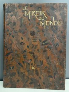 UZANNE (Octave). Le miroir du monde. Notes et sensations de la vie pittoresque. Paris, Quantin, 1888. In-4, broché, couv. illustrée rempliée, liseuse éditeur en cuir japonais avec coins intérieurs estampé à froid et polychromie d'un décor végétal, de fleurs et d'insectes, titre doré sur le plat sup., les lettres imitant le bambou, nom d'auteur doré au dos, doublure de satin havane à décor de fleurs épanouies (petit accroc en tête du dos de la liseuse ; ouvrage débroché, rares rousseurs).