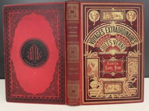 VERNE (Jules). Voyages extraordinaires. Famille-Sans-Nom. 82 dessins de G. Tiret-Bognet et une carte en couleurs. Paris, Hetzel (Bibl. d'éducation et de récréation), [1889]. Grand in-8, cartonnage éditeur toilé rouge, décor du plat supérieur « aux deux éléphants » [A. Souze], médaillon du plat inf. en rouge sur fond noir, tranches dorées [Lenègre] (dos passé, plat sup. très lég. défraîchi, brunissures).