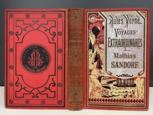 VERNE (Jules). Les voyages extraordinaires. Mathias Sandorf. 111 dessins par Benett, et une carte. Paris, Hetzel (Bibl. d'éducation et de récréation), 1885. Grand in-8, cartonnage éditeur toilé rouge, décor en noir et or au plat supérieur, de type « au ballon avec titre sur fond argent », tranches dorées [plaque de A. Souze, rel. de Lenègre] (dos passé et dont la dorure est effacée, avec semé de fines taches d'encre ; rousseurs).