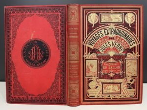 VERNE (Jules). Cinq semaines en ballon. Voyage de découvertes en Afrique par trois anglais. [Suivi de] Voyage au centre de la Terre. Paris, Hetzel (Bibliothèque d'Éducation et de Récréation), vers 1887. In-8, percaline rouge éditeur « aux deux éléphants » d'après une plaque de A. Souze, plat inf. au nom éditeur noir, tranches dorées [A.L. & Cie = Lenègre] (mouillure à la charnière inf., tache en queue du dos).