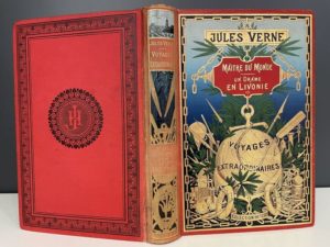 VERNE (Jules). Maître du Monde. Illustrations de George Roux. Un Drame en Livonie. Illustrations de L. Benett. Paris, Collection Hetzel, [1904]. Grand in-8, cartonnage éditeur toilé rouge, décor polychrome type « à la Mappemonde » [Blancheland], dos au phare, tranches dorées (dos passé, mors inf. frotté, brunissures, p. 143 déchirée en marge sans manque).