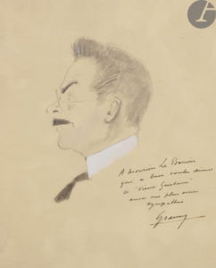 Autoportrait de profil grimé dans un rôle, avec dédicace autographe : « A Monsieur Le Barrois qui a bien voulu aimer ce “Vieux Gustave” avec ma plus vive sympathie Gravey ».