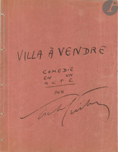 Sacha GUITRY (1885-1957). — Tapuscrit avec additions et corrections autographes, Villa à vendre, [1931] ; cahier — In-4 cousu de [1]-29 pages sous couverture de papier fort rose avec titre autographe signé.