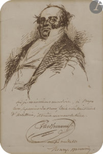 Henry MONNIER (1799-1877). — Autoportrait en Monsieur Prudhomme, avec inscription autographe signée ; encre brune, 17 x 11,5 cm à vue.