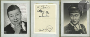 Pierre Bertin (et l.a.s. au dos), Pauline Carton (avec petit dessin ; au dos, 2 amusants dessins, dont un autoportrait), Jeanne Fusier-Gir (photo Harcourt ; au dos, photo dédic. de son portrait par Ch. Gir), Patachou, Jean Rigaux, etc.