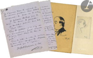 Portraits-caricatures de Rip par BOUET (encre de Chine, 20 x 13 cm, signé, petite fente), et Georges LEPAPE (signé et daté 1920, mine de plomb, 11 x 7 cm).