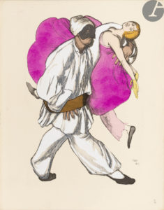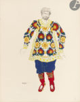 ♦ Très rare album de 25 planches dont 20 coloriées à la main, représentant des œuvres du peintre, décorateur et costumier Léon BAKST (1866-1924), parmi lesquels une majorité de costumes pour les Ballets russes.