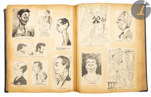 Important album unique réalisé certainement dans les années 40-50, proposant plusieurs milliers de caricatures de personnalités françaises du monde du spectacle de la première moitié de XXe siècle, extraites de journaux et publications diverses, collées sur 400 pages.
