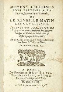 GUEVARA (Antonio de). Moyens légitimes pour parvenir à la faveur, & pour s’y maintenir, ou Le Reveille-matin des courtisans. Paris, De l’Imprimerie de Rob. Estienne, pour Henry Sara, 1623.