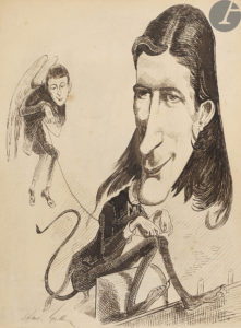 - DESSIN ORIGINAL À LA PLUME SIGNÉ D’ANDRÉ GILL représentant une caricature de Victorien Sardou et Victorien Sulpice dans une répétition de Séraphine au Gymnase. Ce dessin sera reproduit en Une du numéro 52 de L’Éclipse du 17 janvier 1869,