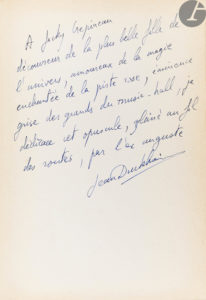 « A Jacky Crepineau // découvreur de la plus belle fille de l’univers, amoureux de la magie // enchantée de la piste rose, éminence // grise des grands du music-hall, je // dédicace cet opuscule, glâné au fil // des routes, par l’ex auguste // Jean Dukheim ».