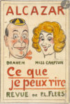 Exemplaire enrichi de la partition de Cousine, chanson créée par Mayol, illustrée d’un portrait de l’artiste par Sem, du dessin original en couleurs signé de Barrère sur papier calque, de l’affichette de la revue de P. L. Flers intitulée Ce que je peux rire, faite pour l’Alcazar et représentant les portraits caricaturés de Dranem et de Miss Campton, d’un superbe dessin du visage d’un clown blanc et du texte Réflexions sur le cirque par Francis Carco, pages 27 à 30 extraites d’un ouvrage.