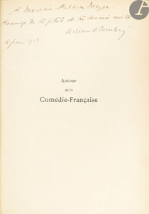- BERNHEIM (Adrien). Autour de la Comédie-Française. Trente ans de Théâtre (5me série). Préface de Jules Claretie. Paris : Devambez, 1913. In-8, 212 x 152 : XIX, 272 pp., (1 f. blanc), 27 portraits, couverture imprimée. Demi-chagrin rouge, dos à nerfs orné, tête dorée, non rogné, couverture conservée (reliure de l’époque).