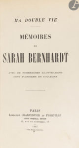 - BERNHARDT (Sarah). Ma double vie. Mémoires de Sarah Bernhardt. Avec de nombreuses illustrations dont plusieurs en couleurs. Paris : Librairie Charpentier et Fasquelle, 1907. In-8, demi-chagrin bleu à coins, dos à nerfs, tête dorée, non rogné, couverture conservée (Aussourd).