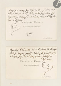 Six cartes de visites de l’auteur ont été également ajoutées, chacune comprenant des notes autographes adressées à Gaston Calmette, directeur du Figaro, ainsi qu’une épreuve corrigée du poème À l’empereur Frédéric III, qui fera partie du recueil Les Paroles sincères en 1891.