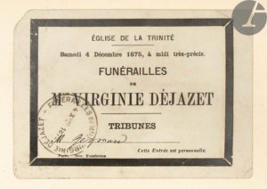 - Entrée pour les funérailles de Virginie Déjazet le 4 décembre 1875 à l’église de la Trinité.