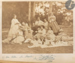 - Photographie originale sur papier albuminé, anonyme, représentant Virginie Déjazet entourée de sa famille dans un jardin, dédicacée par l’artiste à sa nièce et datée de 1862.