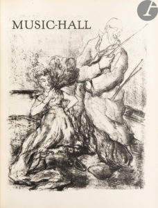 FARGUE (Léon-Paul) - MOREAU (Luc-Albert).Music-Hall. — Paris : Pour les bibliophiles du Palais, 1948. — In-4, 322 x 249 : (2 ff. blancs), 156 pp., (8 ff. 2 derniers blancs), couverture illustrée. — Demi-maroquin rouge à larges bandes,...