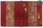 titre de l’ouvrage en lettres capitales de différents maroquins sur les bandes de maroquin rouge du premier plat, surmontées de filets dorés irradiants, ceux de gauche se poursuivant sur le dos et le second plat, dos lisse, tête dorée, non rogné, couverture et dos conservés (Marot-Rodde).