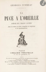 FEYDEAU (Georges). — La Puce à l’oreille. — Pièce en trois actes. — Avec la mise en scène complète et conforme à la représentation. — Paris : Librairie théâtrale, 1910. — In-18, 188 x 127 : (2 ff.), 280 pp., couverture...