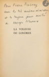 - NEVEUX (Georges). La Voleuse de Londres. Paris : La Table ronde, [1960]. — In-12, broché. Édition originale dont il n’a pas été fait de grands papiers. Exemplaire de presse, enrichi de cet envoi de l’auteur : Pour Pierre Fresnay // avec la très ancienne admiration // et la toujours jeune amitié // de Georges Neveux.