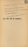 - MARCHAND (Léopold). La Vie est si courte… Comédie en trois actes et cinq tableaux. Représentée pour la première fois, à Paris, le 17 avril 1936, au Théâtre Pigalle. Paris : Bibliothèque de la Société des Auteurs et Compositeurs Dramatiques, [1938]. In-12, broché. Édition originale, dont il n’a pas été tiré de grands papiers. La pièce avait tout d’abord paru en 1936 dans La Petite illustration théâtre.