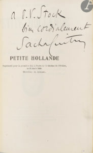 Édition originale réunissant Petite Hollande, comédie représentée pour la première fois sur le théâtre de l’Odéon le 25 mars 1908, suivie du Cocu qui faillit tout gâter, petit acte en vers représenté pour la première fois sur le même théâtre le 21 décembre 1905. Elle est illustrée sur la couverture du portrait de Charlotte Lysès, épouse de Sacha Guitry et créatrice du rôle de Lisbeth dans la pièce.