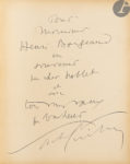 Précieux exemplaire ayant appartenu au comédien Georges Noblet, qui l’offrit au couple Sacerdote formé par la grande couturière et styliste Jeanne (1868-1962) et le négociant Achille (1909-1940). Il comporte ce superbe envoi :