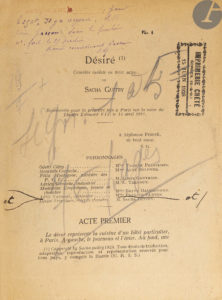 GUITRY (Sacha). — Désiré. — Comédie inédite en trois actes. — [Corbeil : imprimerie Crété, 1928]. — In-8, 190 x 140 : (75 ff.) montés sur onglets. — Toile bleue à la bradel, dos lisse, non rogné, chemise et étui (Ad. Lavaux...