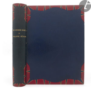 GUITRY (Sacha). — De Jeanne d’Arc à Philippe Pétain. — Paris : Sant’ Andrea et Lafuma, 1944. —  — In-folio, 374 x 275 : 394 pp., (9 ff dernier blanc), couverture imprimée. — Maroquin bleu foncé, pièces irrégulières de...