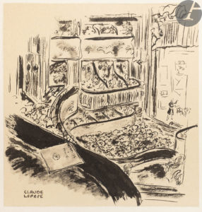 - dessin original signé de Claude Lepape, collé sur papier cartonné et portant au verso l’indication « Répétition générale de Vive l’Empereur au Théâtre de la Madeleine »,