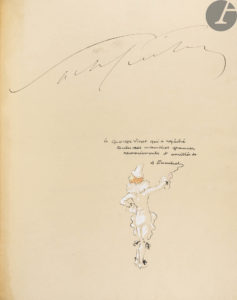 Il est enrichi d’une suite complète des illustrations en noir sur japon, d’une suite de 29 des 33 eaux-fortes sur vélin de Lana, ainsi que de la signature autographe de Sacha Guitry suivie de cet envoi autographe signé de Jacques Touchet, accompagné d’un dessin original :