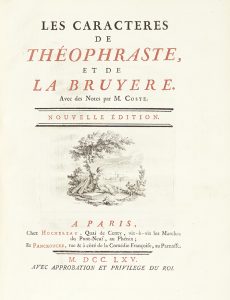 LA BRUYÈRE (Jean de). Les Charactères de Théophraste, et de La Bruyère. Avec des notes par M. Coste. Nouvelle édition. Paris, Hochereau et Panckoucke, 1765.