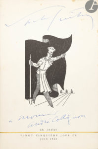 - Programme original pour la revue publicitaire en 2 actes et 16 tableaux intitulée Crions-le sur les toits jouée au Théâtre de la Madeleine en juin 1937 lors des galas de bienfaisance organisés par Sacha Guitry. In-4, agrafé. Exemplaire enrichi d’une photographie de presse en tirage argentique représentant Cécile Sorel et Georges Grey, et du menu pour le repas donné en 1940 pour le centenaire de l’Association de secours mutuels entre les artistes dramatiques, repas au cours duquel fut représenté l’à-propos de Guitry intitulé Cigales et fourmis avec l’auteur, Denis d’Inès, Louis Jouvet et Madeleine Renaud comme interprètes. Ce menu est accompagné d’une lettre signée de Victor Boucher, président de l’association, et de deux photographies originales, en tirage argentique, l’une représentant Sacha Guitry, l’autre figurant ce dernier, Louis Jouvet, Denis d’Inès et Madeleine Renaud durant la répétition de l’à-propos de Guitry.
