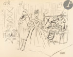 - Dessin original signé à l’encre de Claude Lepape représentant Sacha Guitry et Marguerite Pierry dans Vive l’empereur de Sacha Guitry au Théâtre de La Madeleine (193 x 246).