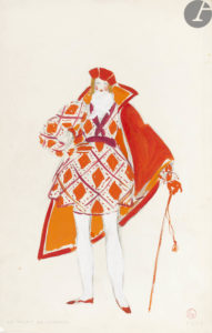 EXEMPLAIRE DE GEORGES LEPAPE, enrichi d’un croquis au crayon représentant un projet pour la page de titre, dessiné au verso d’une phototypie en noir de l’une des planches de costume, et de 2 AQUARELLES ORIGINALES DE PROJETS DE COSTUMES, l’une signée et datée de 1916, de 10,3 x 8,6 cm, représentant le personnage du sanglier pour le ballet russe L’Âge d’or des bêtes joué au théâtre Marigny, la seconde, de grand format (36,2 x 23 cm), portant le cachet de l’artiste et datée de 1915, représentant une étude pour le costume du personnage du valet de carreau dans Le Coup manqué. Ce dernier dessin est différent de celui reproduit dans l’album. On trouve enfin 5 planches refusées en phototypie noire.