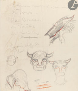 ♦ Précieux exemplaire enrichi de deux pages de croquis avec quelques lignes autographes de Georges Lepape, qui sont des études pour des personnages de la pièce, dont le loup (planche 46), et le taureau (planche 50). On y trouve également deux études originales au crayon de Georges Lepape, non signées, rehaussées à la gouache et à l’aquarelle, pour le premier décor de la pièce.