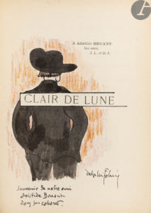 D’après une note que l’on trouve dans un autre exemplaire, cette édition n’aurait été tirée qu’à 50 exemplaires. Celui-ci serait l’un des 15 enrichis de 5 dessins originaux au crayon de couleurs sur japon, signés par Delphi Fabrice, faisant partie de ces « quelques-uns » mentionnés par ce dernier dans sa note. Il comprend également sur le faux titre un dessin original signé du même, représentant Aristide Bruant de dos, accompagné de cette dédicace : « Souvenir de notre ami Aristide Bruant dans son cabaret ».